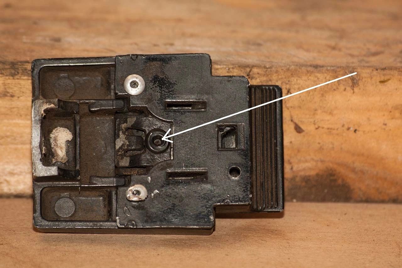 This is the rear view of the latch, the blind rivet indicated by the arrow is the first thing to be removed. Don't worry about the end of the rivet, this is easily removed once the latch has been dismantled.