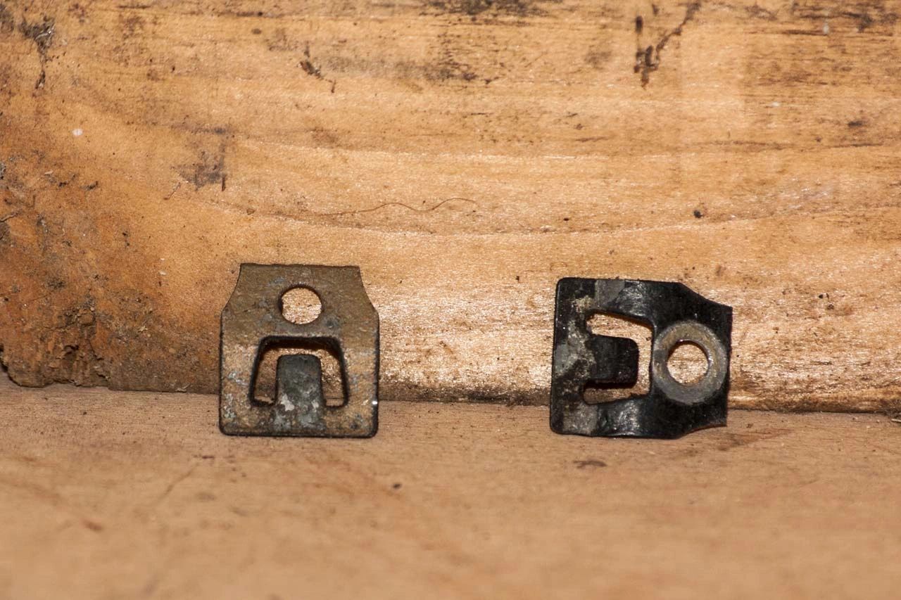 These two clips cen be removed once the blind rivet is drilled our. They are guides for the action of the latch when it is assembled so they need to be kept to one side for replacement in due course.