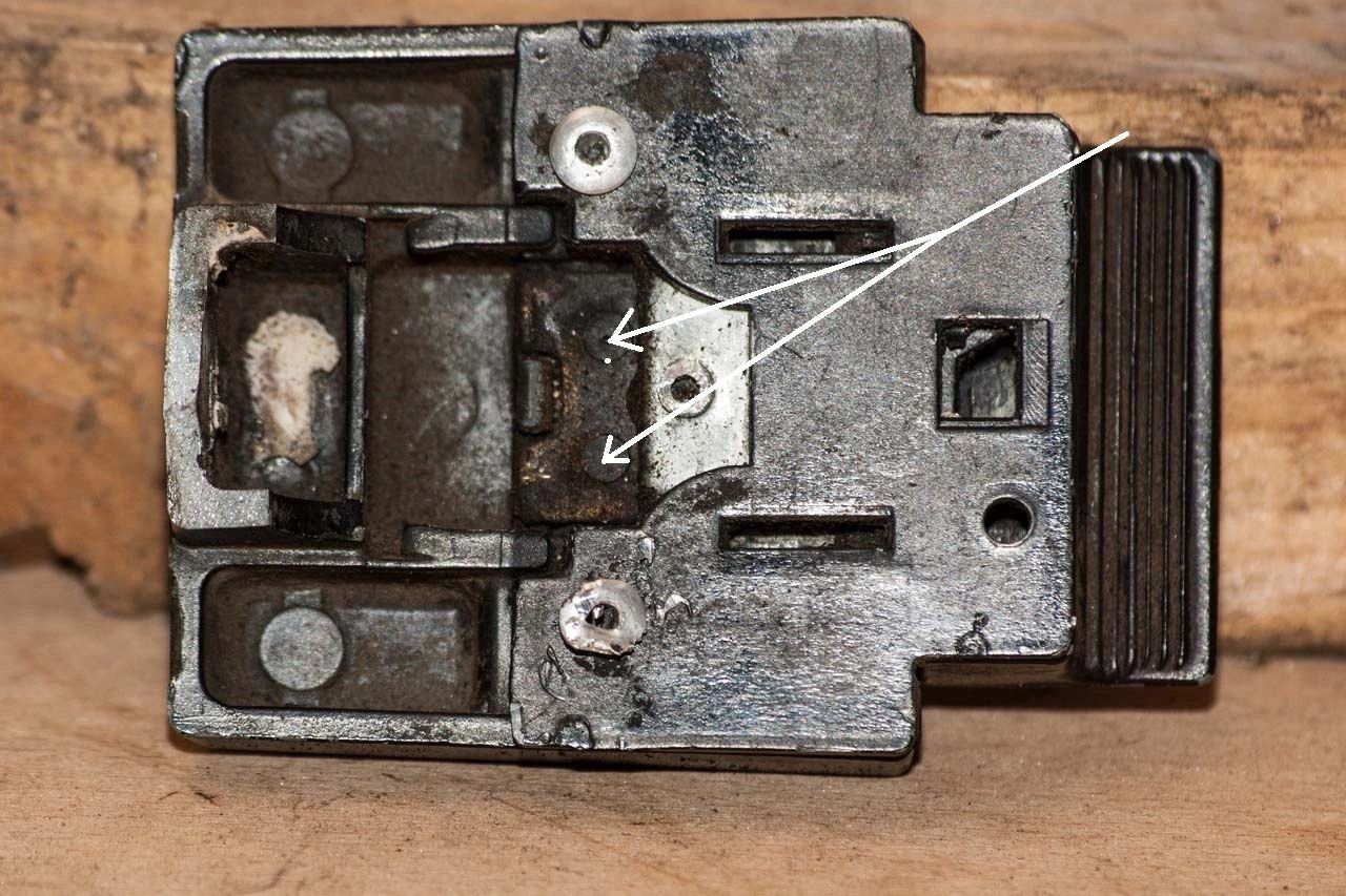 Here we can see the latch with the steel plate removed. The arrows point to two pins that were held in position by the plate.